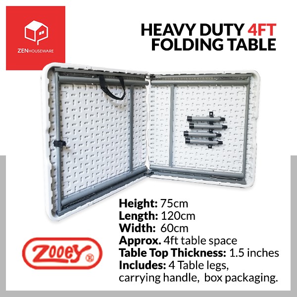 Buy Zooey 4FT Heavy Duty Budget Folding Table 269-Mini online at Lazada Philippines. Requires little maintenance Rust Resistant Powder Coated Strong Steel Frame and Fold-away legs 6FT Wide Table Space 72 inches 6-10 table seater capacity OPEN SIZE length x width height. May 24 at 200 AM.